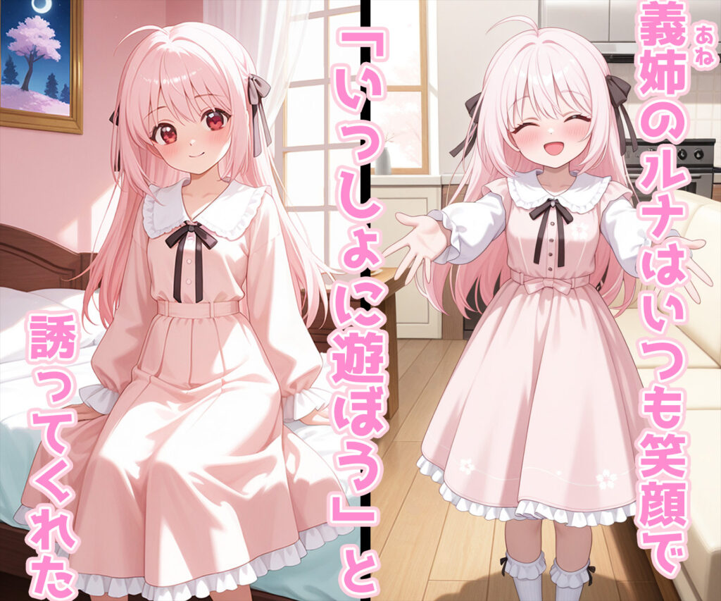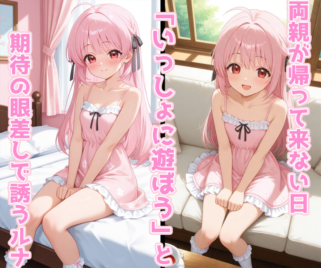 総訪問者: 183 人 今日: 6 人 昨日: 8 人 いっしょに遊ぼう💕NEW‼ ソフィアちゃんと遊ぼう💕NEW‼紗寿叶ちゃんと遊ぼうヤミちゃんと遊ぼうイリヤちゃんと遊ぼう えっちな観察日記ALBUM3💕NEW‼えっちな観察日記ALBUM2えっちな観察日記ALBUM1 オリジナルキャラクター「ルナ」を中心に描く、漫画風・ストーリー重視の成人向け同人誌サークルです。日常から少しずつ変化していく関係性と“遊び”をテーマにした物語を制作しています。「遊ぼう」シリーズ販売中 いっしょに遊ぼう-小さくても、大人なんだよ- ルナと、はじまりの遊び 「いっしょに遊ぼう」ルナが弟くんと触れたい確かめたいという気持ちを重ねている。姉と弟の間でだけ通じるひみつの愛言葉。 FANZA 販売サイトへ DLsite 販売サイトへ ※ログインが必要となります。ログイン後、再度クリックをお勧めします。 アニメキャラクターを題材にした二次創作イラスト集を制作しています。可愛さとえっちを大切にした一枚絵中心の作品がメインです。 いっしょに遊ぼう-イリヤちゃんと遊ぼう- 『イリヤちゃんとの遊びの思い出』アニメキャラクターをモチーフにした成人向けイラスト集です。 FANZA 販売サイトへ DLsite 販売サイトへ ※ログインが必要となります。ログイン後、再度クリックをお勧めします。 いっしょに遊ぼう-ヤミちゃんと遊ぼう- 『ヤミちゃんとの遊びの思い出』アニメキャラクターをモチーフにした成人向けイラスト集です。 FANZA 販売サイトへ DLsite 販売サイトへ ※ログインが必要となります。ログイン後、再度クリックをお勧めします。 いっしょに遊ぼう-紗寿叶ちゃんと遊ぼう- 『紗寿叶ちゃんとの遊びの思い出』アニメキャラクターをモチーフにした成人向けイラスト集です。 FANZA 販売サイトへ ※ログインが必要となります。ログイン後、再度クリックをお勧めします。 いっしょに遊ぼう-ソフィアちゃんと遊ぼう- 『ソフィアちゃんとの遊びの思い出』アニメキャラクターをモチーフにした成人向けイラスト集です。 FANZA 販売サイトへ DLsite 販売サイトへ ※ログインが必要となります。 ログイン後、再度クリックをお勧めします。 Xの投稿の差分をイラスト集にしています。LunA.I.animesweeTで投稿した成人向けのイラスト集投稿時とは違った彼女たちの表情やえっちさを観察してください。 えっちな観察日記-ALBUM1- イリヤちゃん、ヤミちゃん、紗寿叶ちゃんをえっちに観察した成人向けイラスト集です。 FANZA 販売サイトへ DLsite 販売サイトへ ※DLsite版は一部キャラクターを除いたバージョンです。詳細はDLsiteサンプルをご確認ください。 ※ログインが必要となります。 ログイン後、再度クリックをお勧めします。 えっちな観察日記-ALBUM2- イリヤちゃん、ヤミちゃん、ソフィアちゃん、セリアちゃん、ティナちゃん、ルーちゃんをえっちに観察した成人向けイラスト集です。 FANZA 販売サイトへ DLsite 販売サイトへ ※ログインが必要となります。 ログイン後、再度クリックをお勧めします。 えっちな観察日記-ALBUM3- イリヤちゃん、ヤミちゃん、ソフィアちゃん、セリアちゃん、ティナちゃん、ルーちゃんをえっちに観察した成人向けイラスト集です。 FANZA 販売サイトへ DLsite 販売サイトへ ※ログインが必要となります。 ログイン後、再度クリックをお勧めします。 えっちな観察日記-ALBUM4-発売準備中 3月24日発売予定 FANZA 販売サイトへ DLsite 販売サイトへ ※ログインが必要となります。 ログイン後、再度クリックをお勧めします。